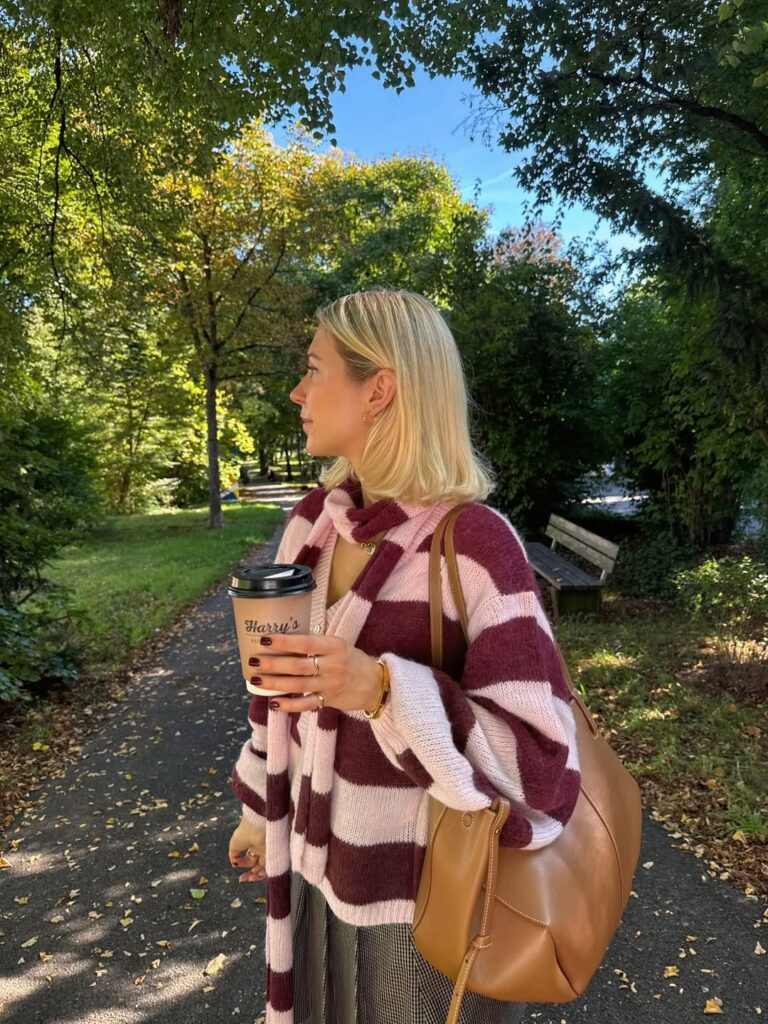 A striped knit cardigan is a versatile wardrobe piece that adds both warmth and visual interest to your look. Its relaxed fit and textured knit create a cozy layer you can easily throw over your everyday basics, whether jeans, trousers, or casual dresses. The stripes introduce a playful, modern touch that makes the outfit feel intentional without trying too hard. This look is perfect for laid-back daytime outings, study sessions, or casual office hours, offering comfort while subtly enhancing your outfit’s personality.
