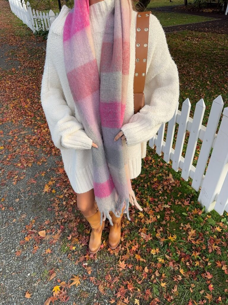 Pairing an oversized cream sweater dress with a plaid wool scarf creates a classic, cozy outfit with subtle seasonal charm. The sweater dress provides warmth and an effortlessly chic silhouette, while the plaid scarf introduces color, texture, and a timeless autumn-winter feel. This outfit is perfect for weekend markets, brunch outings, or casual meetups. It achieves a beautiful balance between relaxed comfort and polished layering, making it both practical and stylish.