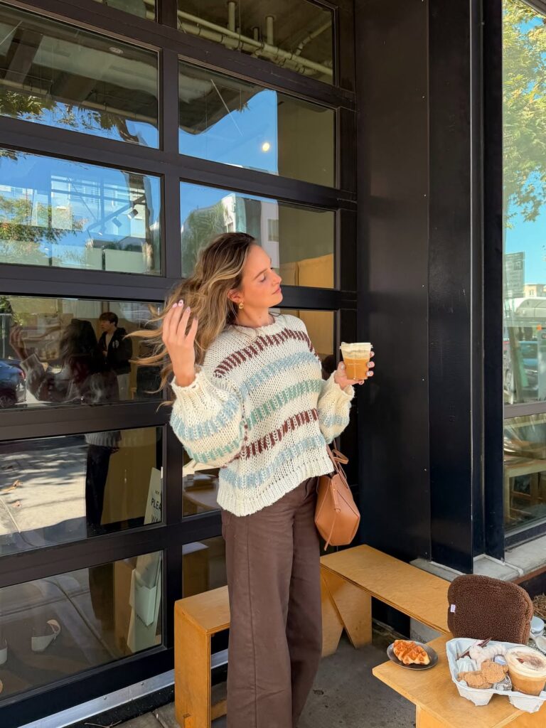 A chunky striped knit paired with cocoa trousers creates an outfit that feels warm, grounded, and visually engaging. The stripes bring personality and pattern, while the cocoa trousers add depth and earthy sophistication. This look suits casual outings, office-casual environments, or cozy afternoons spent indoors. The heavier knit balances beautifully with the tailored feel of the trousers, creating a comfortable yet put-together ensemble ideal for cooler days.