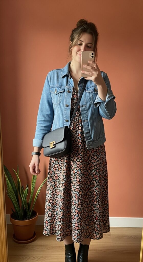 A floral midi dress paired with a classic denim jacket is the perfect early fall combo. It balances feminine charm with casual vibes and keeps you comfortable when temperatures fluctuate. Complete the look with ankle boots and a crossbody bag for a polished touch. This effortless outfit works beautifully for brunch or a relaxed day out.