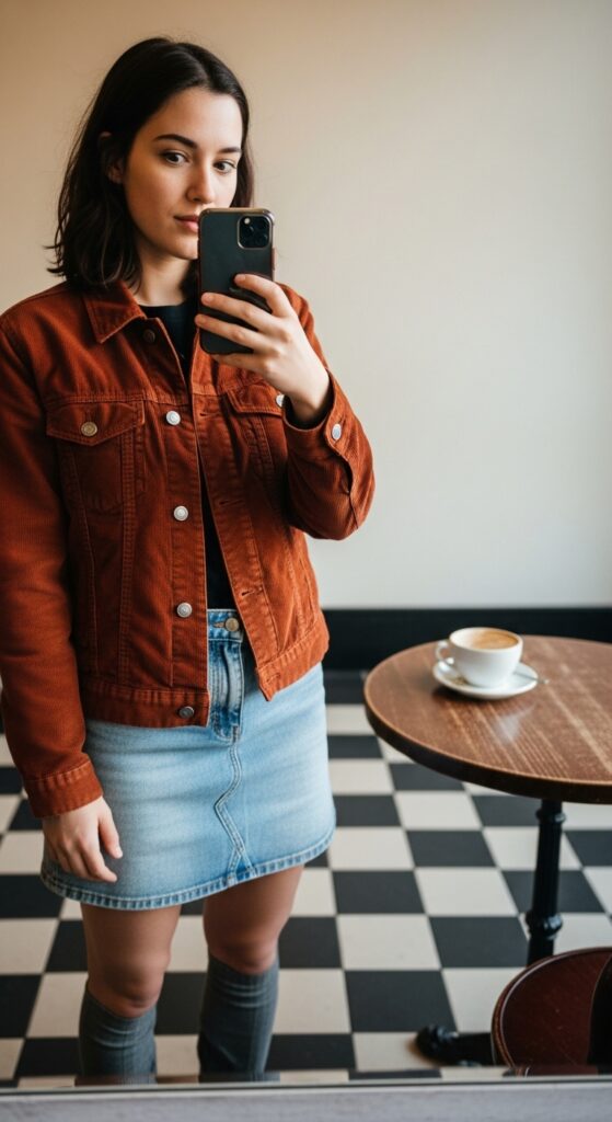 Corduroy makes a strong comeback in early fall. Style a corduroy jacket over a denim skirt for a retro-inspired look. Add knee-high boots or sneakers for versatility. This combination is cute, warm, and perfect for crisp outdoor adventures or pumpkin patch days.