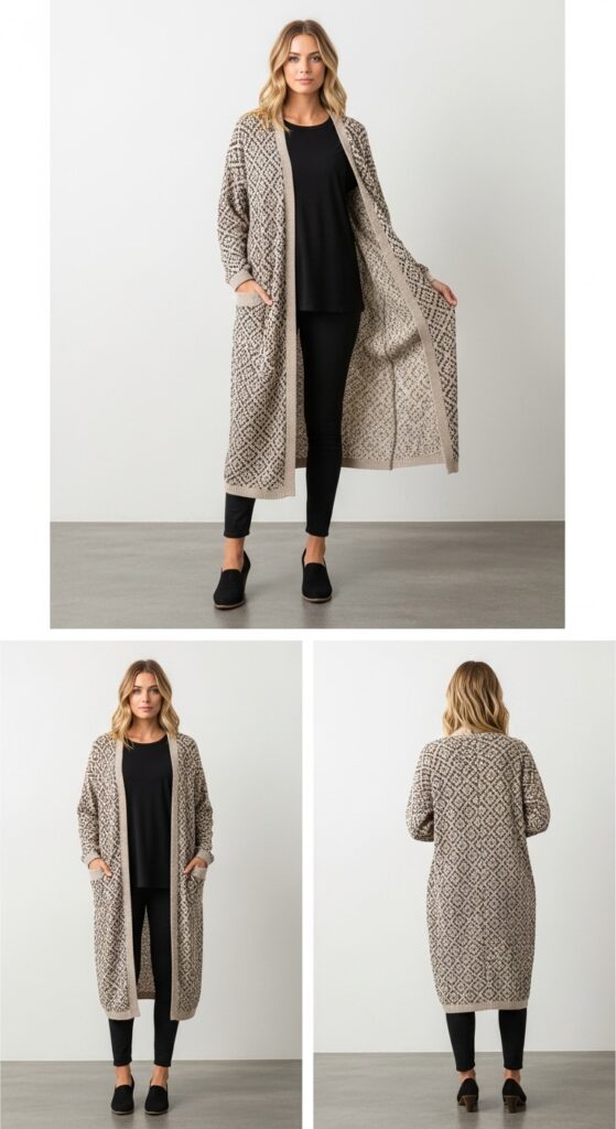 Nothing says comfort like a long cardigan and black leggings. Pair with a simple top and sneakers for errands or lounging days. Add a tote bag and sunglasses for a chic, casual look. This outfit proves that cozy can still look put-together.