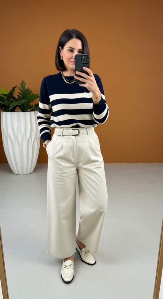Striped sweaters are timeless and trendy. Pair one with high-waisted, wide-leg pants for a modern, comfy outfit. Neutral or navy stripes keep it classy, while loafers or mules complete the look. It’s ideal for casual Fridays or a stylish travel day.