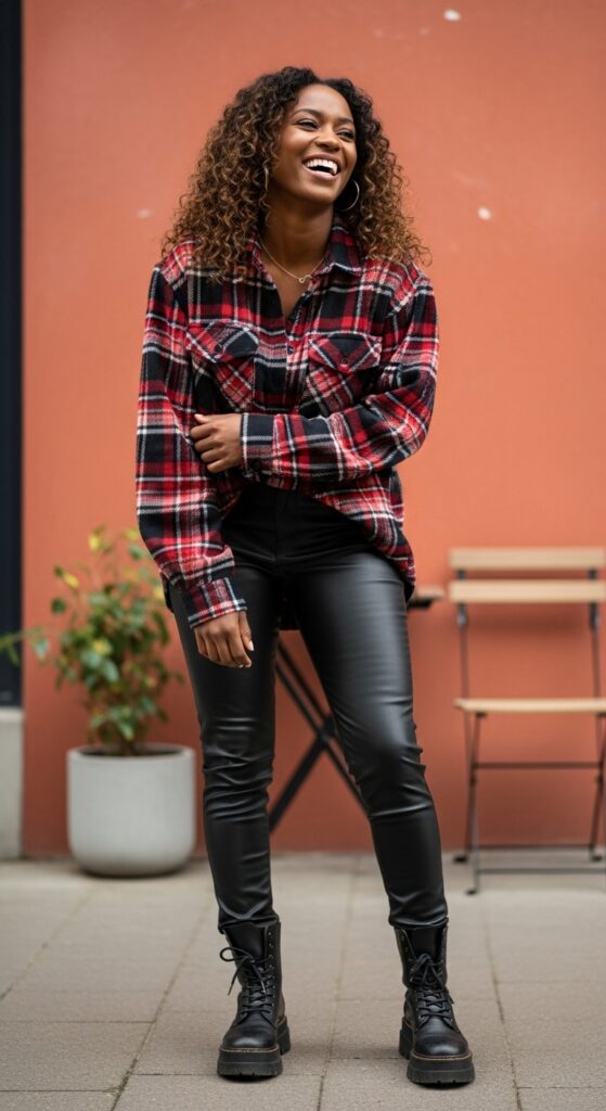 Mix cozy and edgy with a flannel shirt tucked into faux leather pants. Add white sneakers or combat boots for attitude. This combination blends warmth with cool-girl energy — perfect for early fall coffee runs or casual nights out.