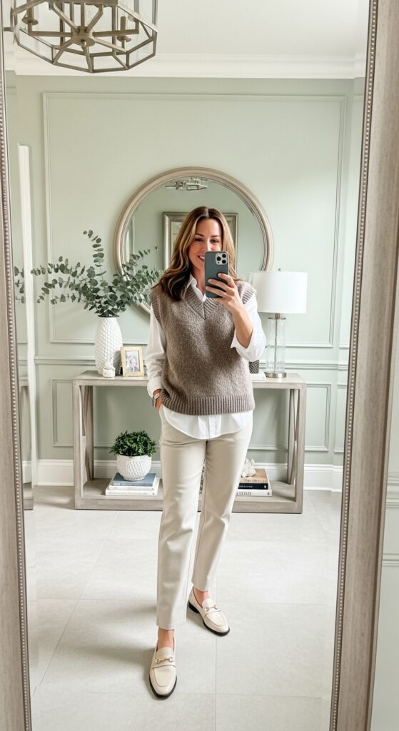 Layering a sweater vest over a crisp white shirt is a fall classic. Pair with trousers or jeans for a preppy, polished aesthetic. Complete the look with loafers or ankle boots. It’s perfect for early fall when you want structure without bulk.