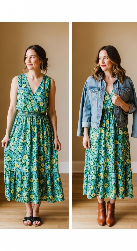 Your summer midi dress can easily transition into early fall by adding ankle boots and a light cardigan or jacket. Add a belt to define your waist and a crossbody bag for charm. This outfit is romantic yet practical for changing temps.