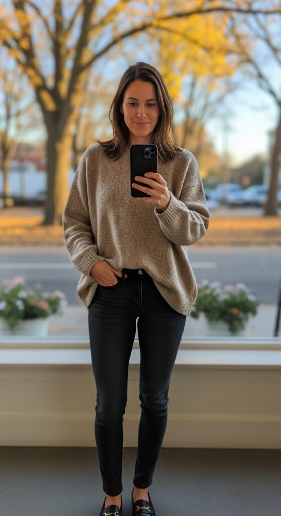 When mornings turn crisp, an oversized sweater is a must-have. Pair it with dark skinny jeans for a flattering silhouette. Neutral tones like beige, camel, or oatmeal give cozy sophistication, while sneakers or loafers add a comfy finish. This outfit feels effortlessly chic and ideal for those laid-back early fall weekends.