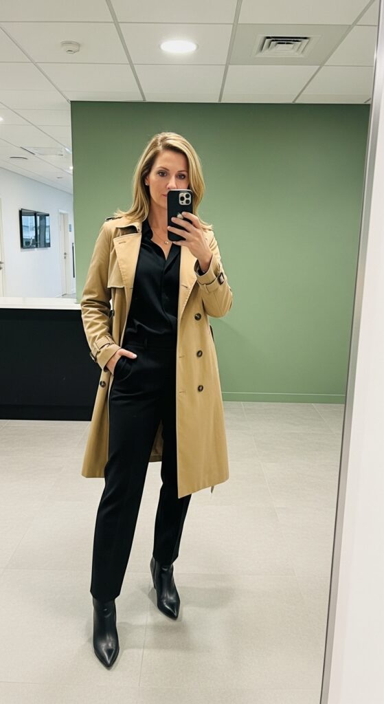 A trench coat is your early fall essential for those breezy mornings. Pair it with tailored pants and a tucked-in blouse for a sophisticated yet comfortable outfit. Neutral shades like tan or cream keep it versatile. Perfect for business-casual days or city strolls, this look oozes confidence and style.