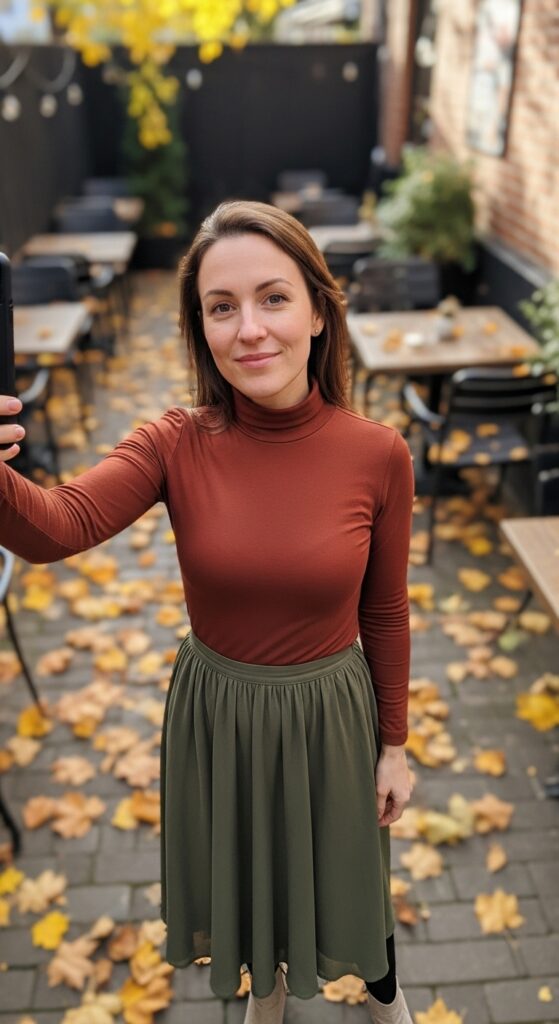 A fitted turtleneck tucked into a flowy midi skirt is elegant and easy to wear. Choose autumn tones like rust, forest green, or mustard for a cozy feel. Add ankle boots and minimal jewelry for a refined yet approachable look. Perfect for workdays or weekend brunches alike.