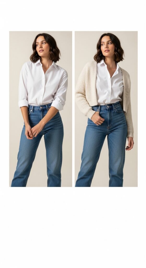 Layering a cropped cardigan over a crisp white button-up creates a polished yet relaxed aesthetic. Pair it with straight jeans or tailored trousers and loafers. This early fall outfit is effortlessly classy — perfect for school, errands, or casual office days.