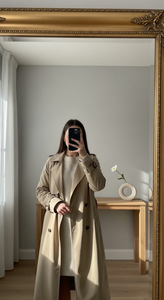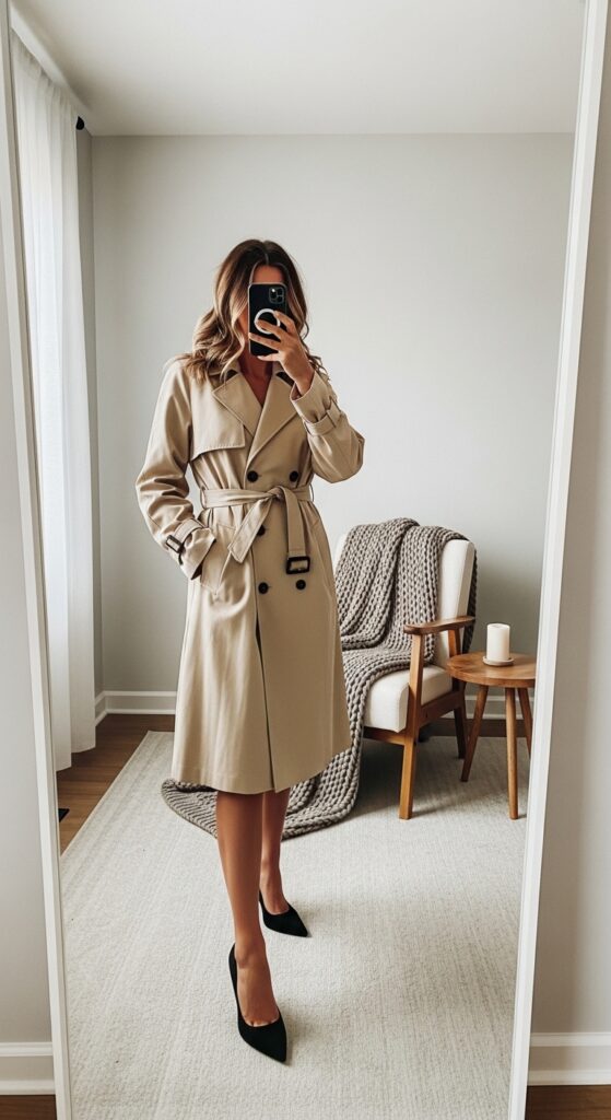 A classic trench coat paired with tailored pants creates an effortlessly refined fall outfit. Layer with a silk blouse and finish with heeled boots for a polished look. A structured handbag and minimal jewelry complete the ensemble. This outfit blends practicality with timeless elegance, making it perfect for both city strolls and office-ready days. The trench coat remains a chic, must-have fall staple year after year.