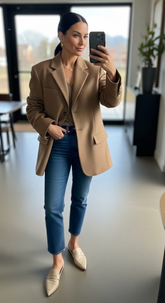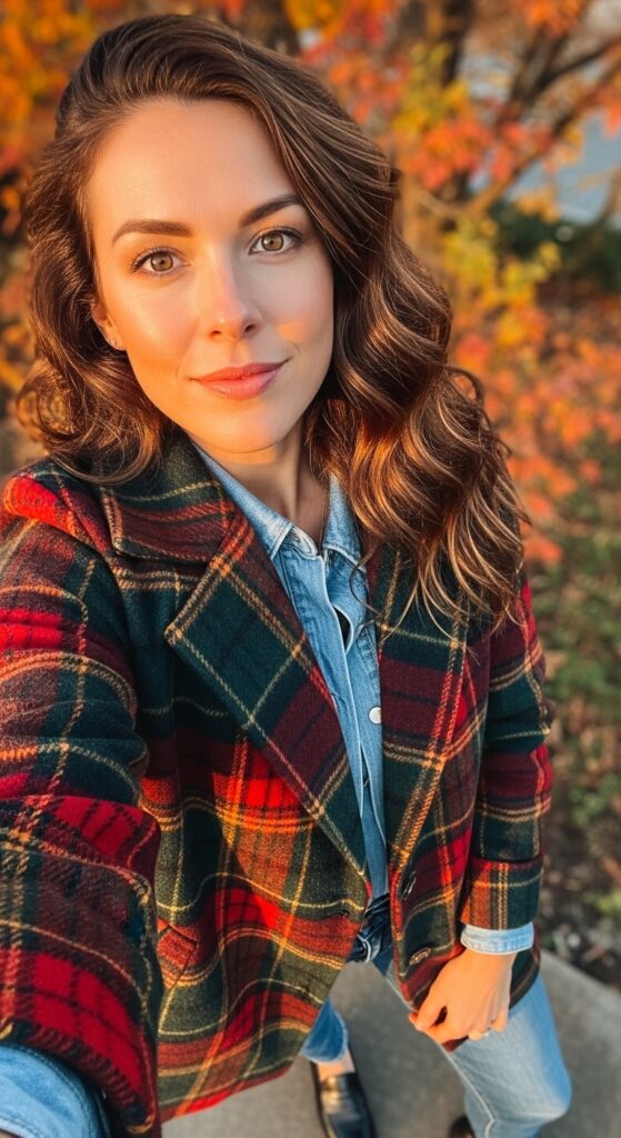 For casual elegance, pair straight-leg jeans with a fitted turtleneck and a plaid blazer. Complete with heeled boots and a structured handbag. Add gold accessories to elevate the look. Plaid instantly brings fall vibes, while jeans keep the outfit comfortable. This chic combination is versatile enough for casual Fridays at work or weekend coffee runs while maintaining a polished, stylish appearance.