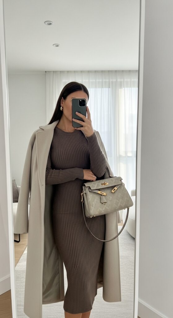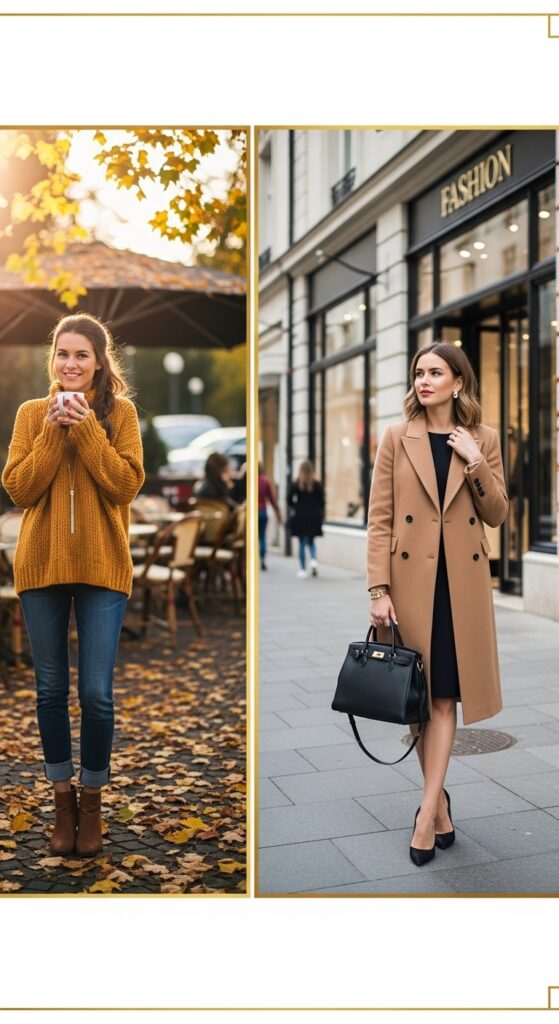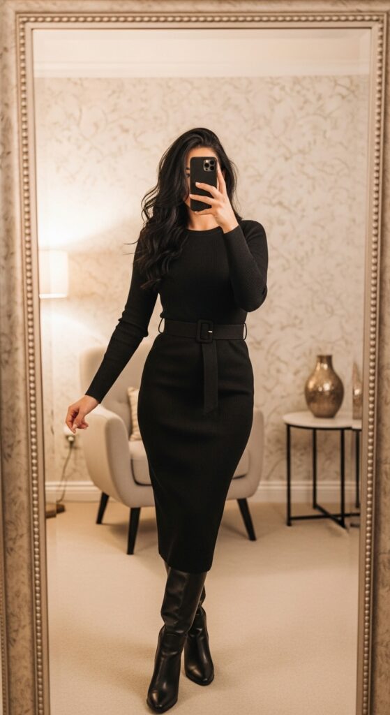 A cozy sweater dress instantly looks elevated when styled with knee-high leather boots. Add a statement belt to cinch the waist and throw on a wool coat for added warmth. Neutral shades like cream, taupe, or camel give this outfit a timeless charm. Comfortable yet chic, this look is perfect for coffee dates, brunch outings, or casual fall evenings where effortless elegance matters most.