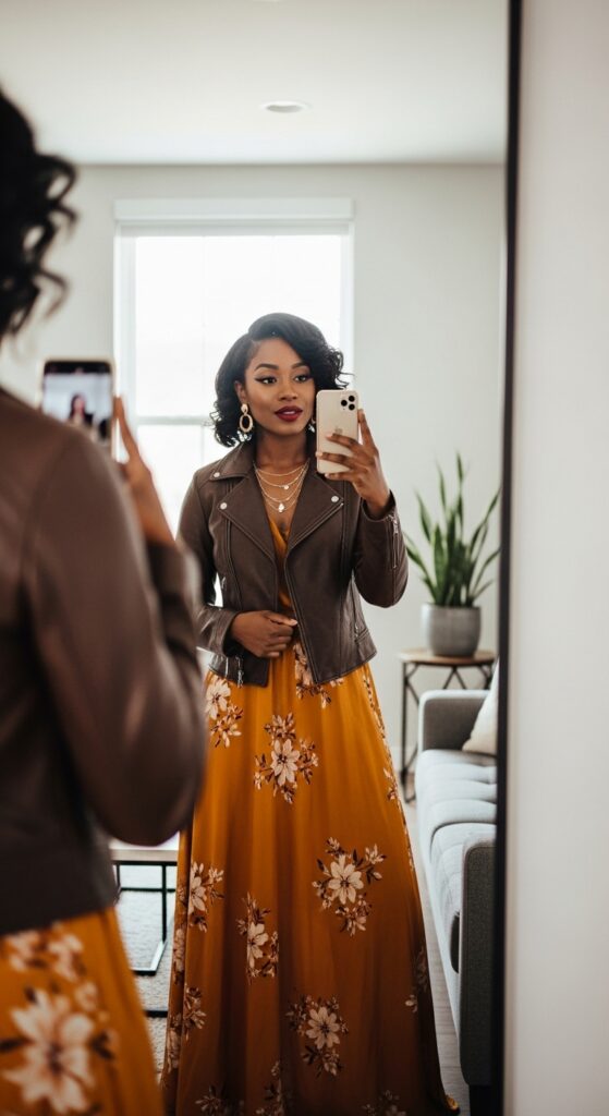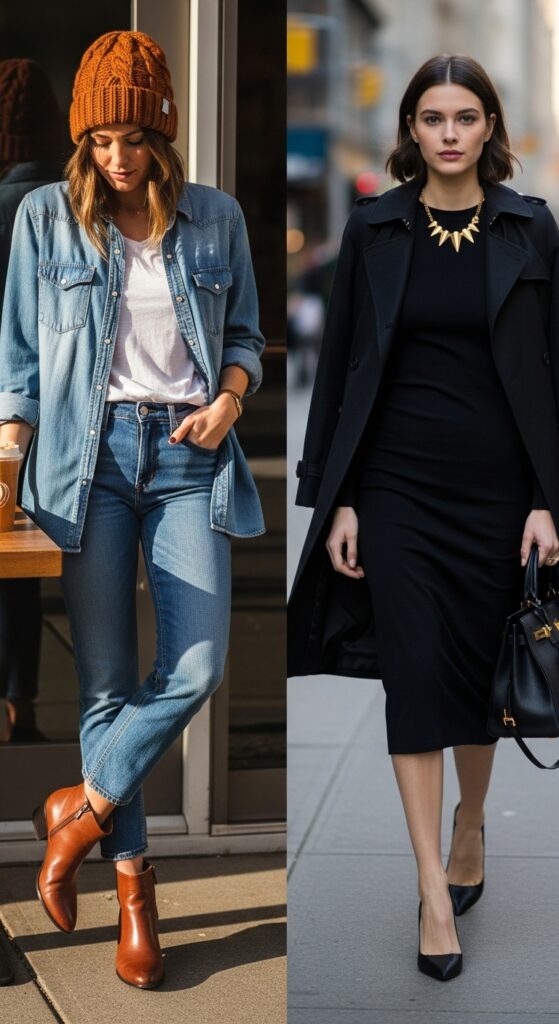 A fitted pencil dress styled with a cropped jacket creates a sleek, feminine fall look. Pair with pointed heels and a structured handbag for polish. Autumn tones like maroon, olive, or navy bring seasonal charm. This outfit is ideal for workdays or professional events, but it transitions easily into evening wear too. The cropped jacket adds structure while keeping the look elegant.