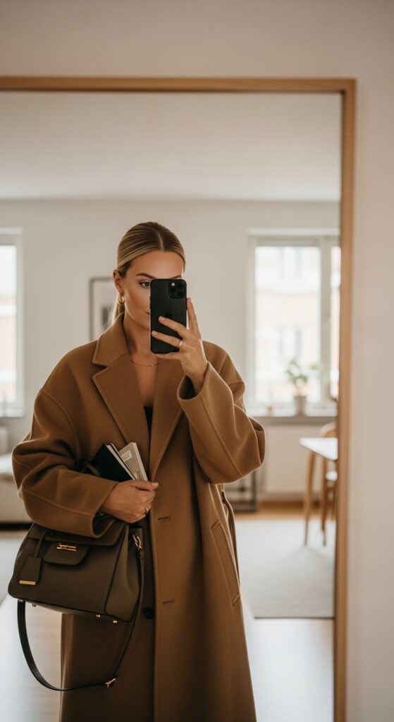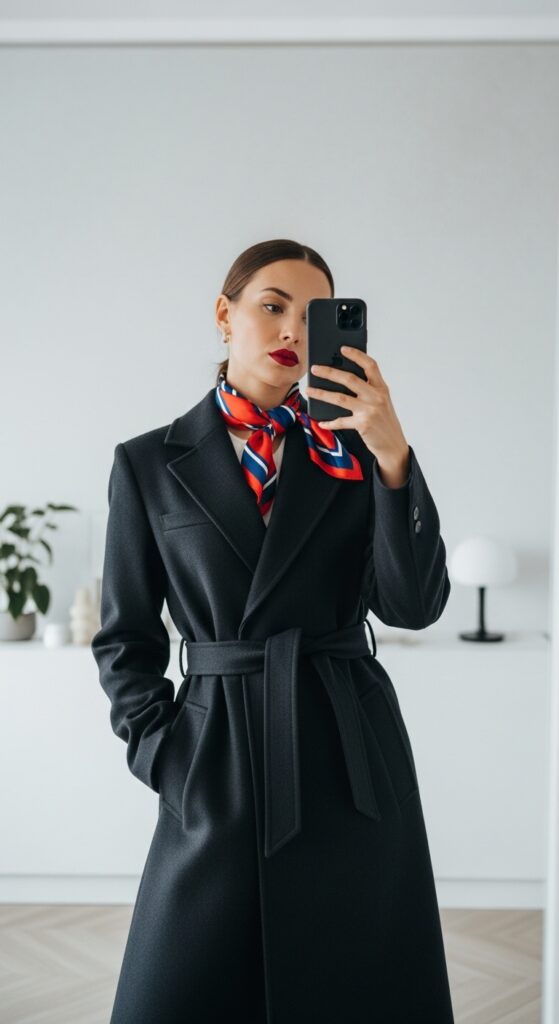 Update your classic wool coat by cinching it with a wide leather belt for a modern twist. Pair with slim trousers or a midi skirt and ankle boots for balance. Minimal jewelry keeps the focus on the silhouette. This ensemble combines structure with elegance, proving small styling changes can create bold Pinterest-ready fall outfit inspiration while keeping things chic and timeless.