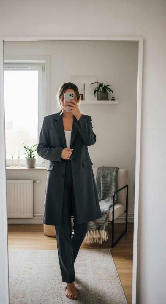 A slim-fit turtleneck tucked into straight-leg trousers looks effortlessly chic when styled with a midi-length tailored coat. Complete the outfit with ankle boots and a structured crossbody bag. Neutral tones like camel, cream, and charcoal enhance the timelessness of this look. Perfect for layering, this outfit is cozy yet elegant, making it an essential fall uniform for anyone who loves clean, refined aesthetics.
