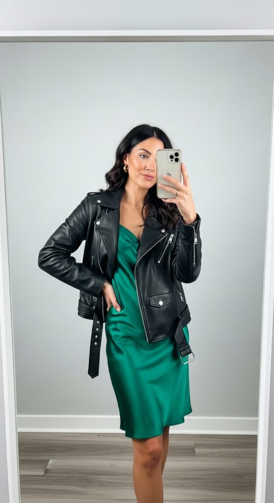 Elevate your evening look with a satin midi dress layered under a long wool coat. Add ankle boots or strappy heels, depending on the occasion, and accessorize with a clutch and delicate earrings. Jewel tones like emerald or navy make this outfit shine for fall events. Feminine yet cozy, this combination is perfect for romantic dinners, weddings, or sophisticated fall gatherings.