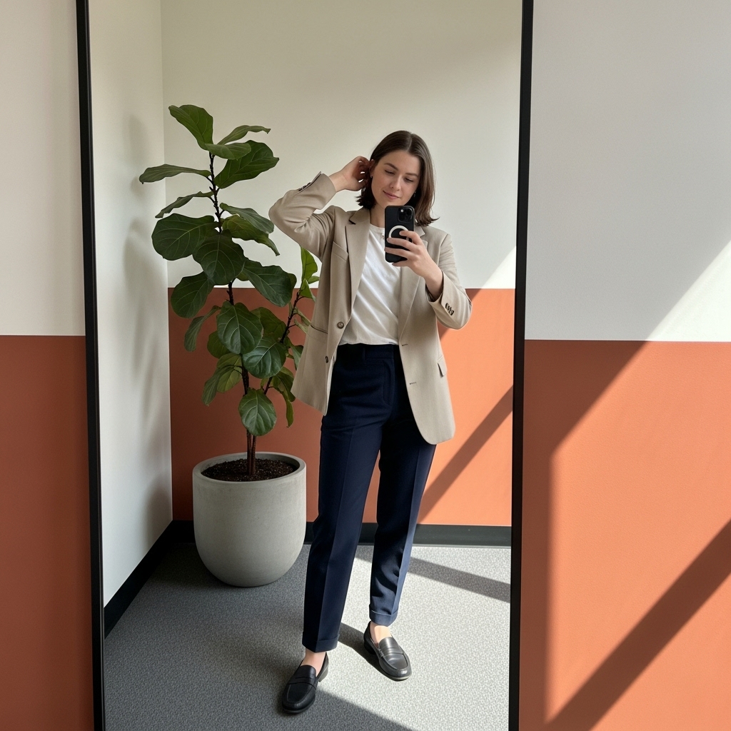 A beige or taupe blazer paired with a crisp white tee and tailored trousers defines relaxed sophistication. Add loafers or block heels to complete the office-ready vibe. This outfit transitions effortlessly from workdays to after-hours dinners — a must-have foundation for any fall business casual wardrobe.