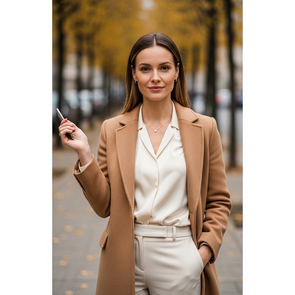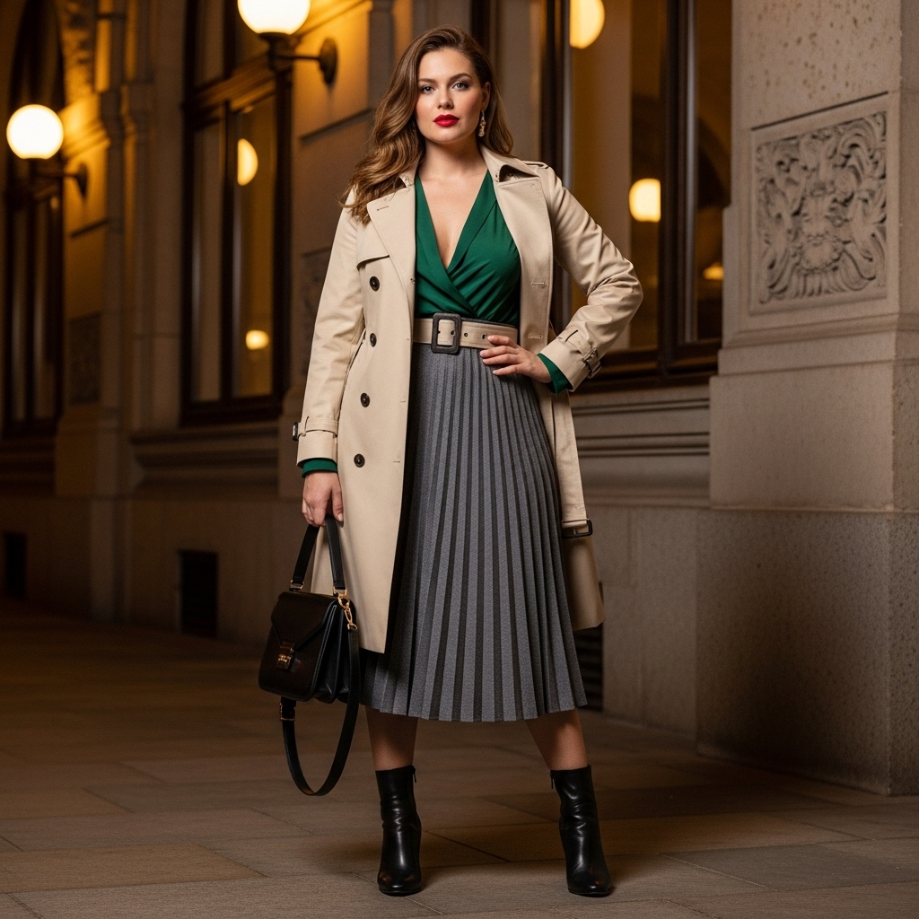 A beige trench coat layered over a pleated skirt creates a sophisticated, feminine look. Add a tucked-in blouse and simple heels or boots. The trench coat adds structure while keeping you warm — an ideal balance of style and practicality for fall business settings.