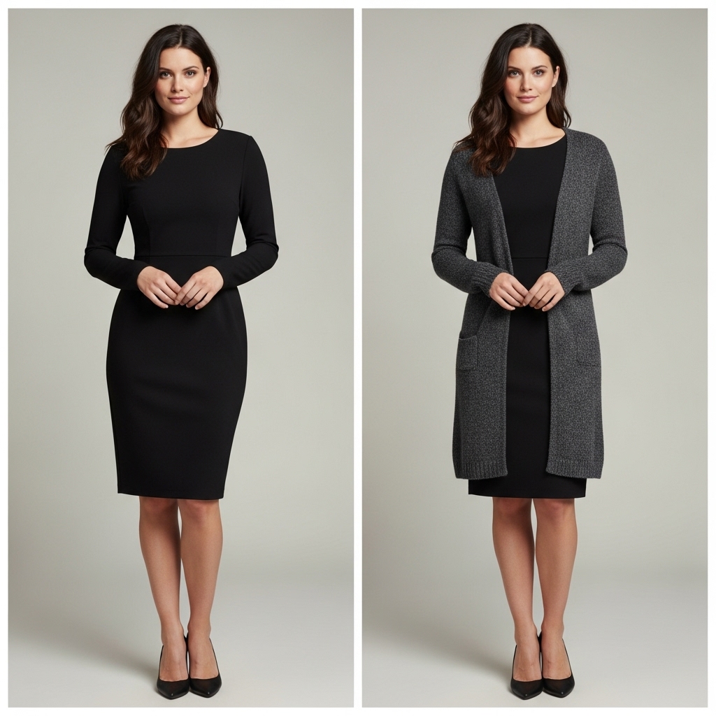 Layer a longline cardigan over a fitted sheath dress for a soft, cozy office look. Choose neutral shades like tan, oatmeal, or gray. Add heeled boots or loafers. This pairing adds warmth and texture while maintaining a professional silhouette that flatters every shape.