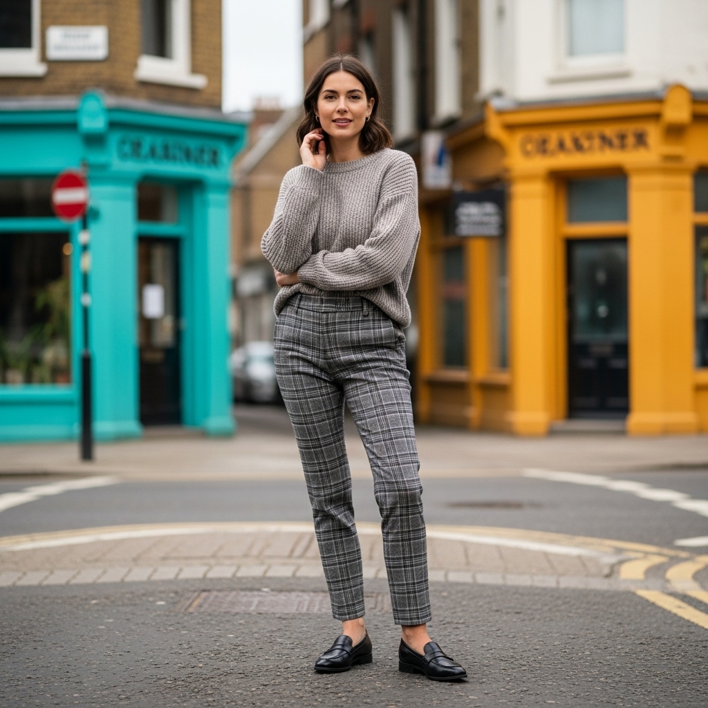 Plaid trousers scream fall. Pair them with a neutral-toned knit sweater and loafers for a perfect business casual vibe. This outfit offers structure and comfort — the ideal combo for long meetings or creative office environments. Add a crossbody or tote to finish.