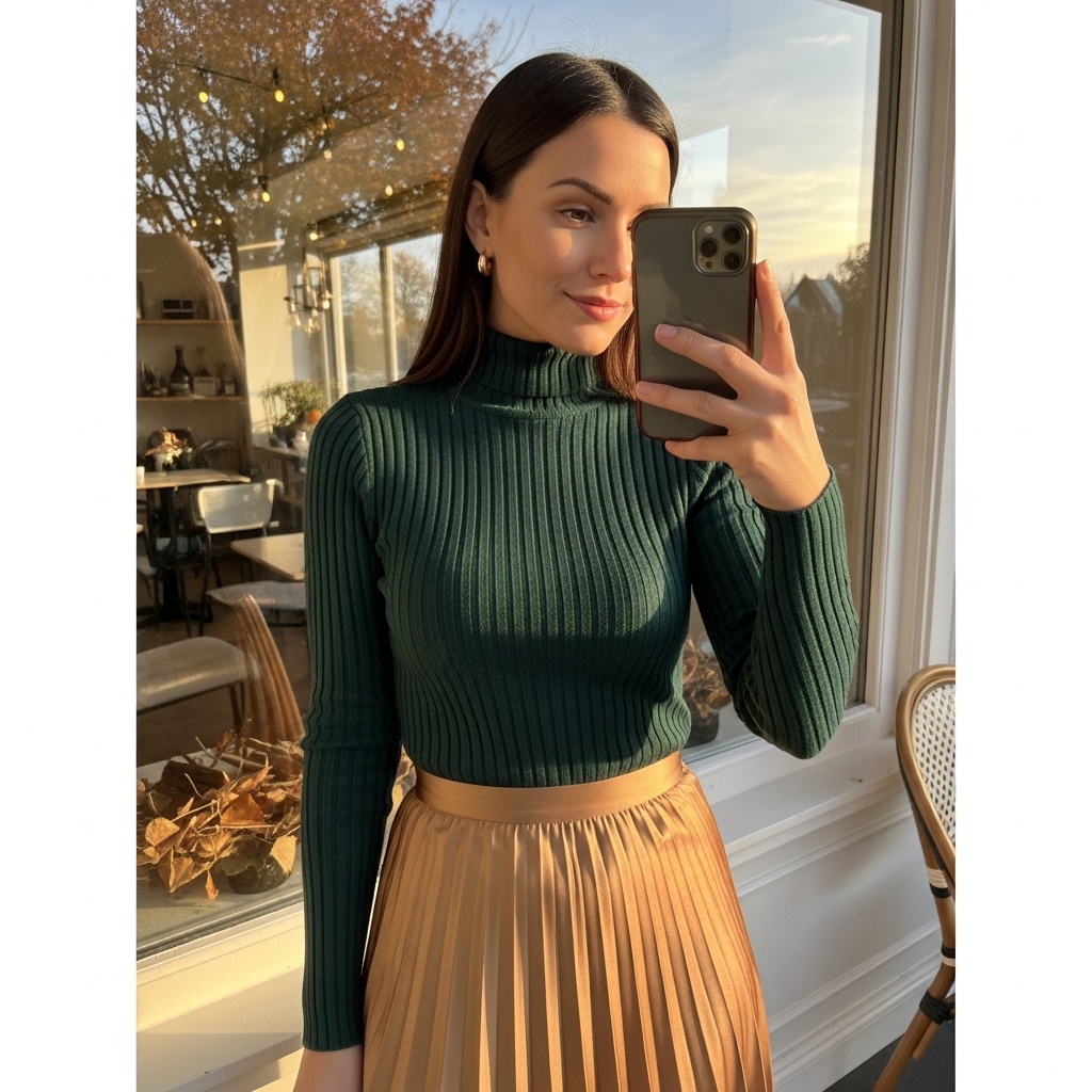 A fitted turtleneck tucked into a pleated or satin midi skirt creates an elegant and feminine fall silhouette. Finish with ankle boots and a structured tote. It’s warm, professional, and perfect for brisk mornings. Neutral or jewel tones make this look seasonally on point and office-friendly.