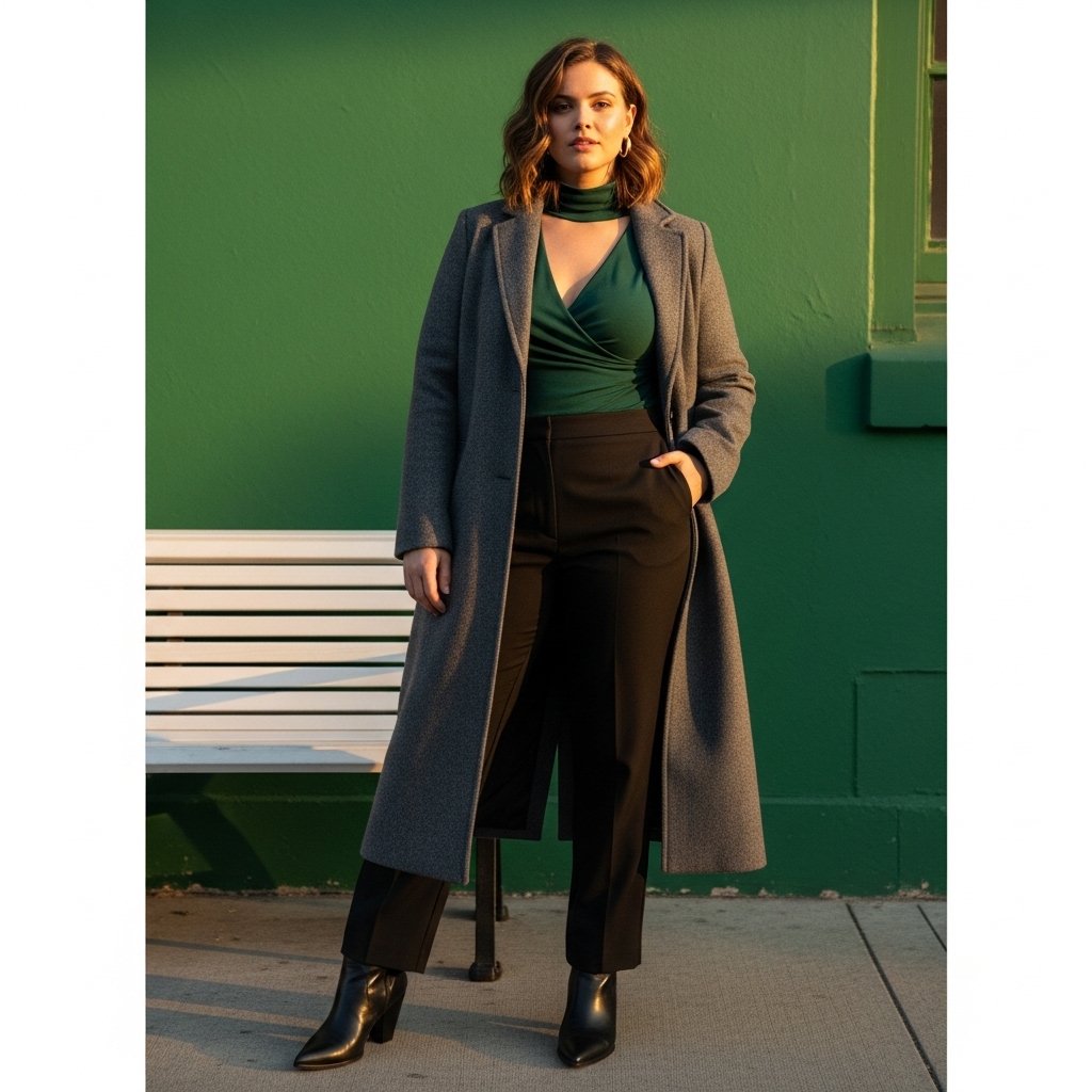 For colder fall days, style a classic wool coat over a turtleneck and tailored dress pants. Add ankle boots and minimal jewelry for a refined, professional look. This timeless combo keeps you warm while maintaining that sleek business casual aesthetic.