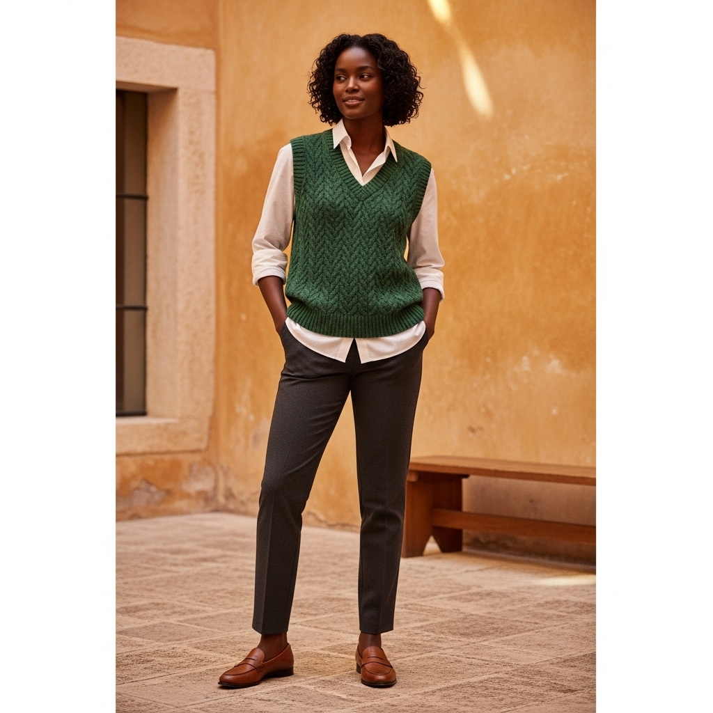 Layer a chunky knit vest over a crisp button-down for a polished preppy aesthetic. Pair it with slim-fit trousers or wide-leg pants depending on your vibe. This smart layering trick keeps you cozy without feeling bulky — ideal for transitional fall weather at the office.