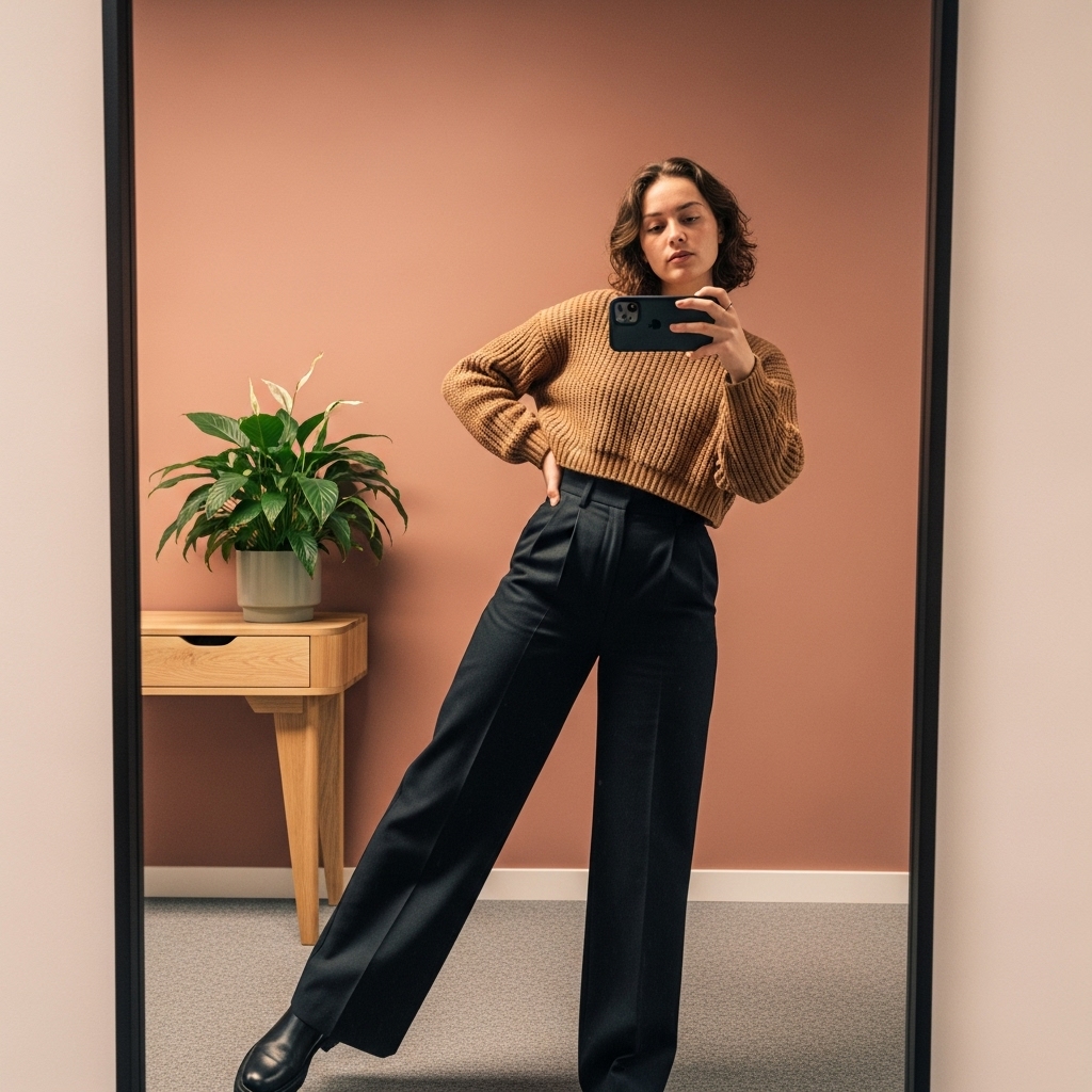 Pair high-waisted, wide-leg trousers with a cropped sweater for a modern twist on business casual. This proportion play adds shape while keeping things cozy. Stick to neutral or muted tones for office appropriateness, and finish with loafers or mules.