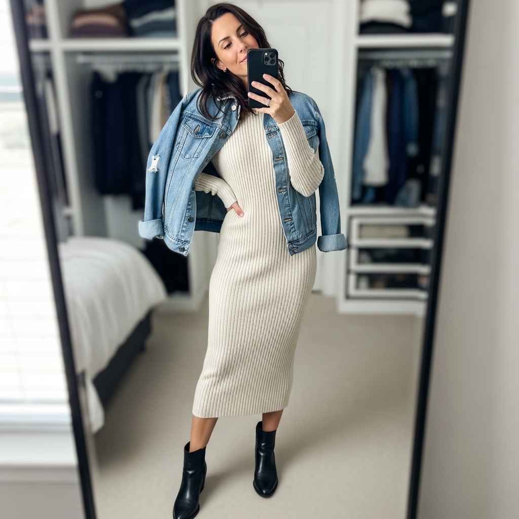 A denim jacket layered over a knit dress creates an easy-going, chic fall outfit. Add ankle boots or sneakers for a casual vibe, or heeled boots for a more polished touch. This combination balances cozy textures with relaxed layering, making it versatile for day-to-night wear in the autumn season.