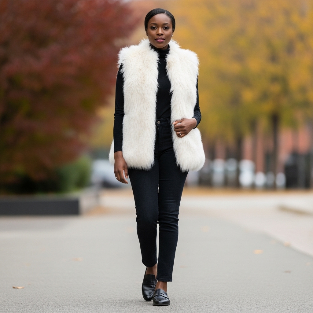 A faux fur vest adds instant chicness to layered outfits. Style it over a turtleneck and slim jeans, then finish with ankle boots or loafers. This look adds texture and a touch of glam while still being practical for fall weather. It’s perfect for casual outings or elevating a basic everyday look.