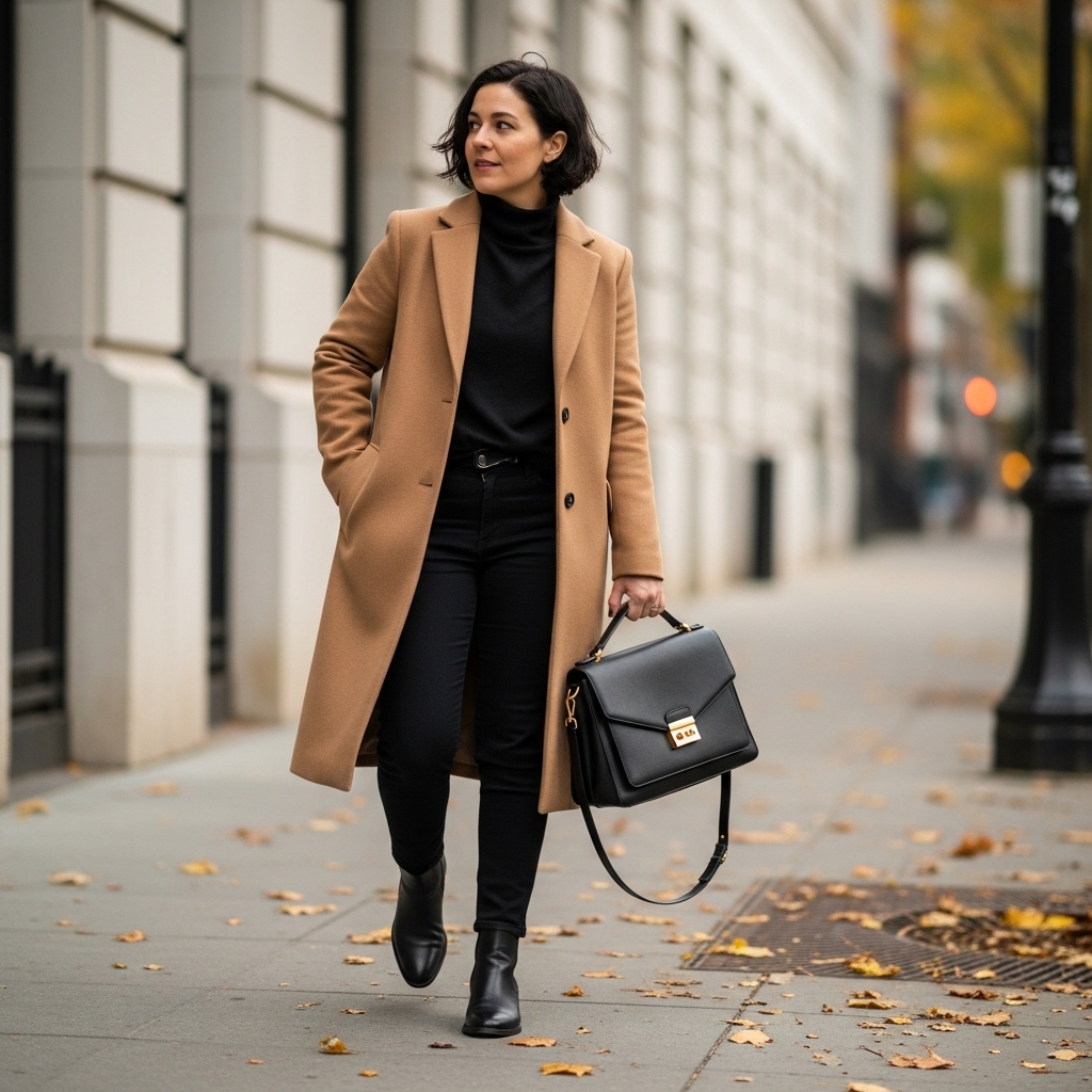 An all-black outfit layered under a camel coat is timelessly chic. Pair black jeans, a turtleneck, and boots with a sleek camel coat for instant sophistication. This look requires minimal effort yet delivers maximum style impact. It’s a classic fall ensemble suitable for work, evenings out, or simply feeling put-together on colder days.