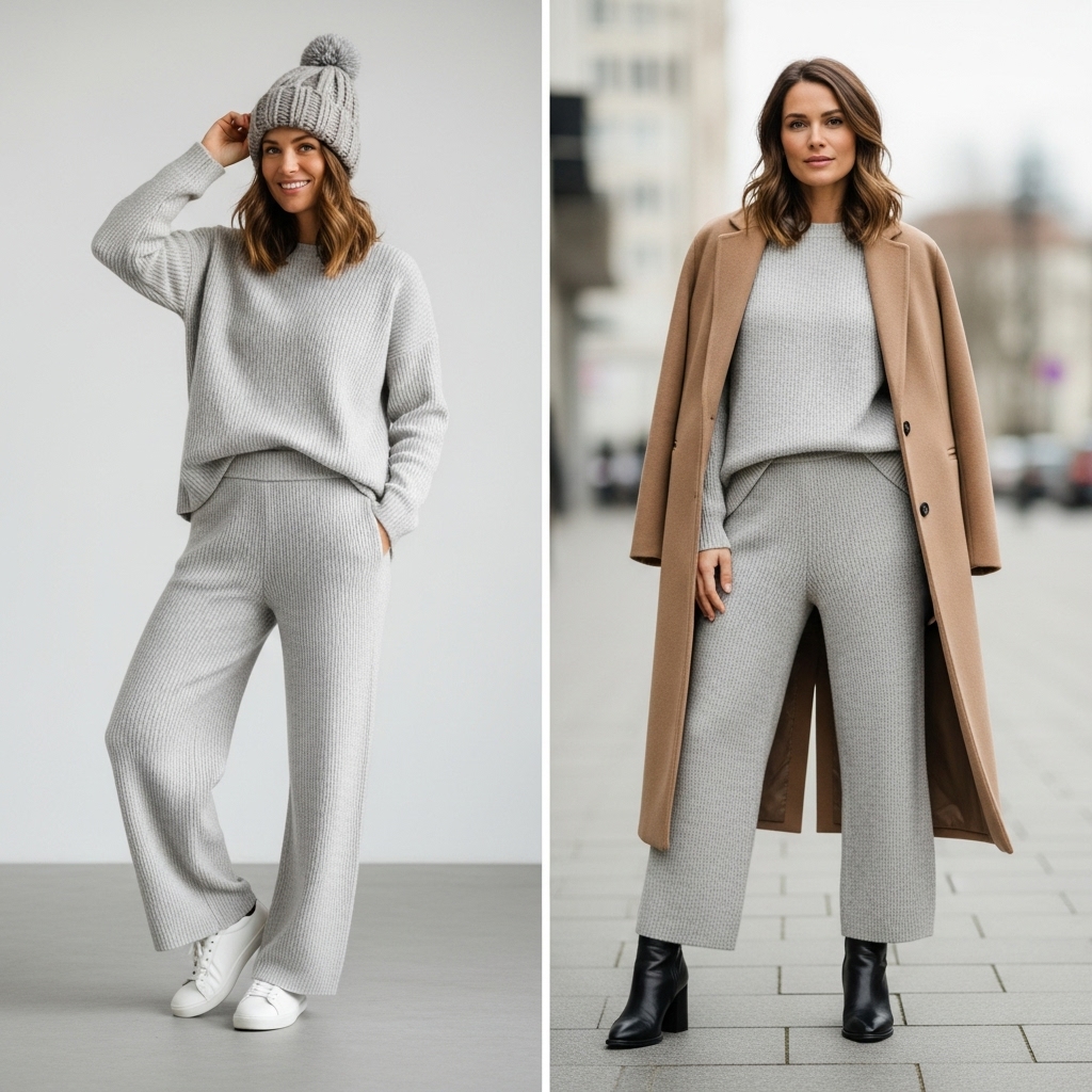 Knit co-ord sets are both cozy and chic, making them a must-have for fall. A matching knit top and skirt or pants create a seamless look that’s easy to style. Pair with Uggs for casual comfort or heeled boots for added sophistication. This outfit is versatile, cozy, and perfect for fall travel or lounging in style.