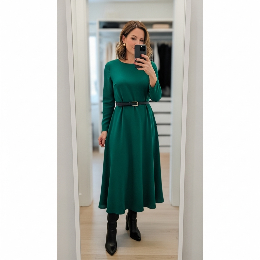 A belted midi dress styled with boots creates an effortlessly chic fall outfit. Opt for earthy tones or floral prints to align with autumn vibes. Add a wide belt to cinch the waist and a structured bag for polish. This look blends femininity with practicality, making it a great choice for both day and evening occasions.
