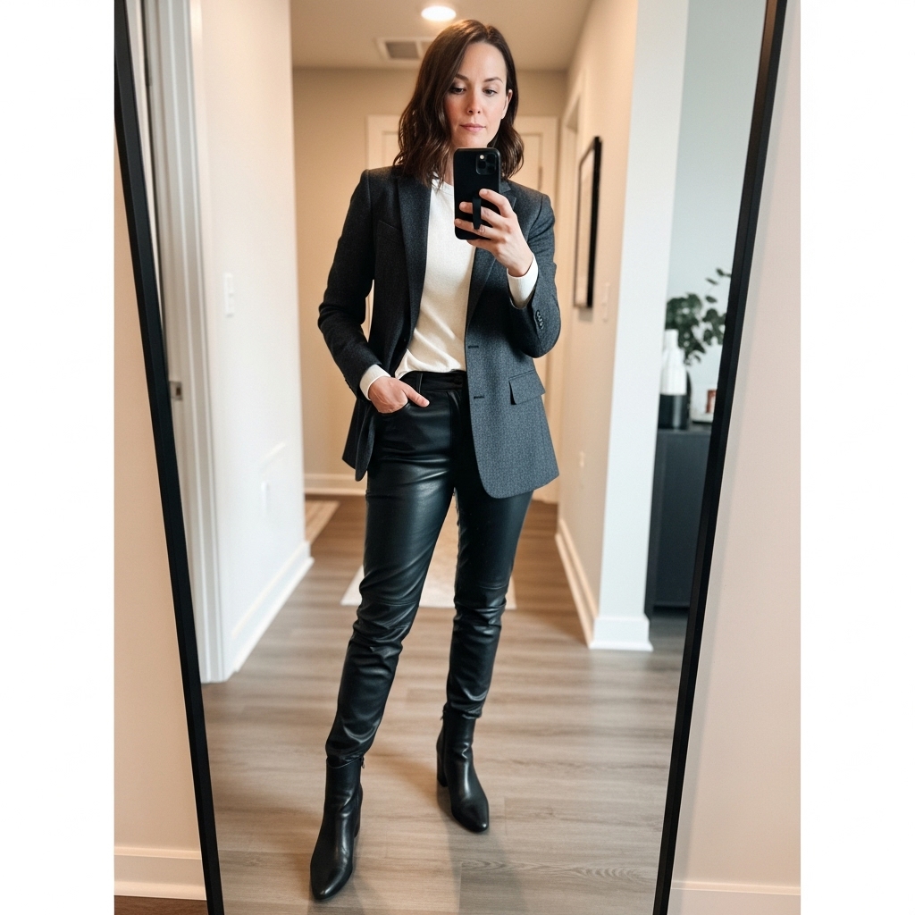 A tailored blazer styled with leather pants is the definition of chic edge. Pair with ankle boots and a sleek blouse for a modern fall outfit. Add statement earrings or a bold bag to finish the look. This combination is versatile, balancing professional sophistication with bold autumn style.