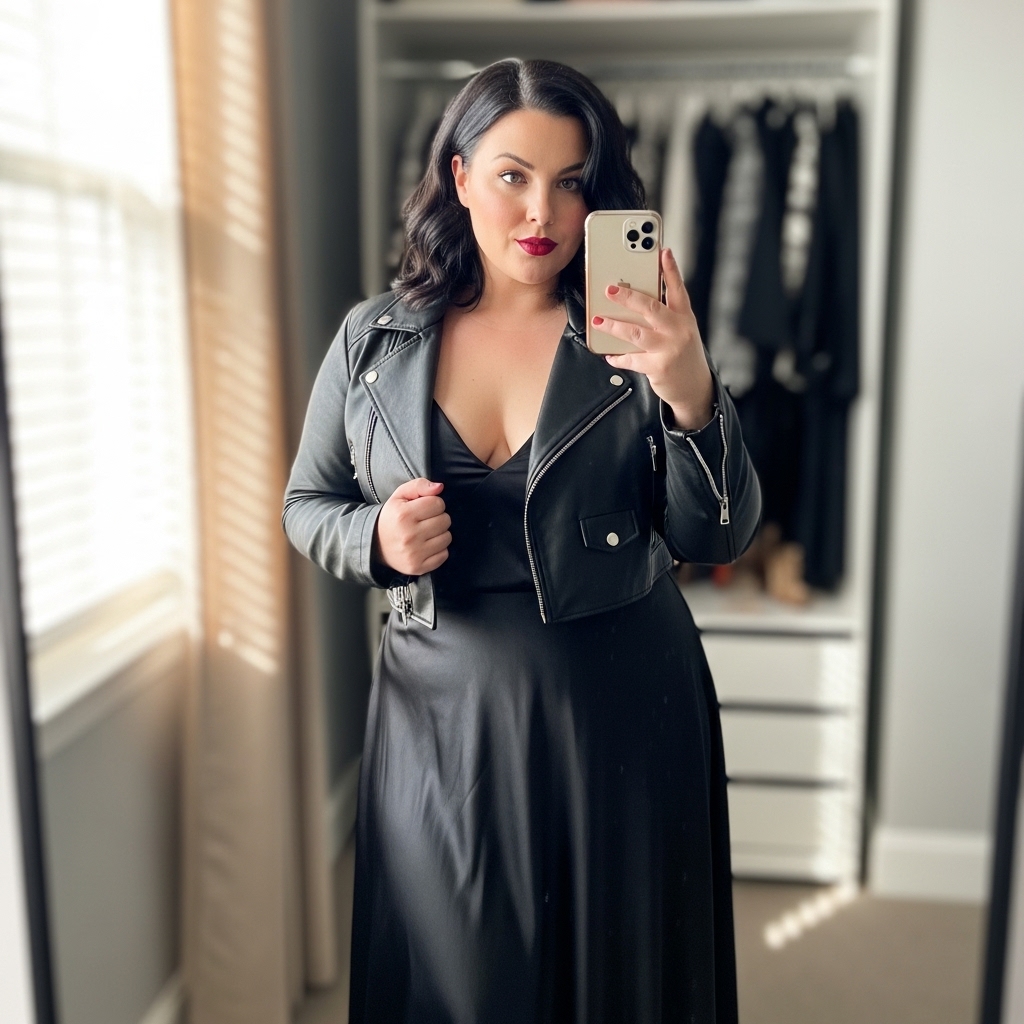 Pairing a leather jacket with a flowing midi skirt strikes the perfect balance between edgy and feminine. Opt for a pleated or satin skirt in jewel tones and add heeled boots to elevate the style. A cropped leather jacket helps define your shape while keeping the vibe chic. This outfit is versatile for day-to-night transitions during fall.