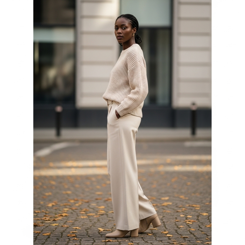 Monochrome neutrals are timeless and effortlessly chic. Combine a cream knit sweater with matching trousers and finish with beige ankle boots. Layer with a wool coat for added warmth. This tonal outfit is sleek and sophisticated, giving off polished vibes without much effort. It’s ideal for both office wear and weekend outings.