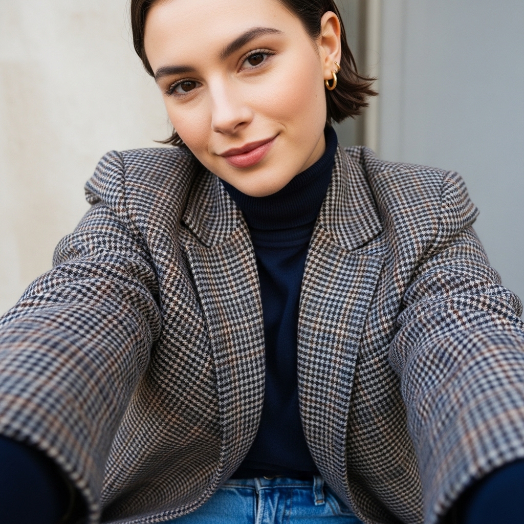 Plaid blazers are a fall must-have that instantly elevate denim looks. Style a checked blazer with straight-leg jeans, a simple turtleneck, and ankle boots. Add gold accessories for a refined finish. This outfit merges comfort with business-casual chic, making it perfect for both coffee meetings and weekend shopping trips.