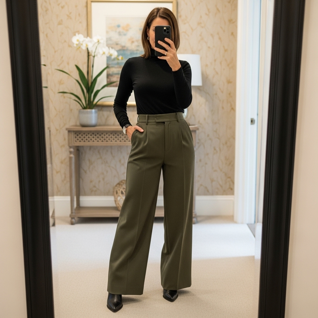 A fitted turtleneck tucked into wide-leg trousers creates an elongated, chic silhouette. Stick to muted fall shades like olive, camel, or deep brown, and pair with pointed-toe heels or boots. Add a sleek belt to accentuate your waistline. This minimalist yet powerful look is perfect for work or evening dinners in the cooler months.
