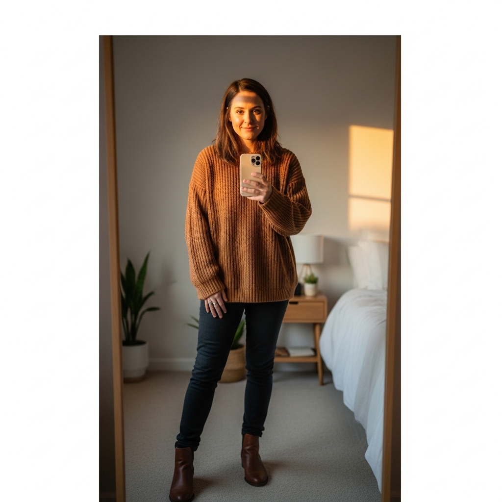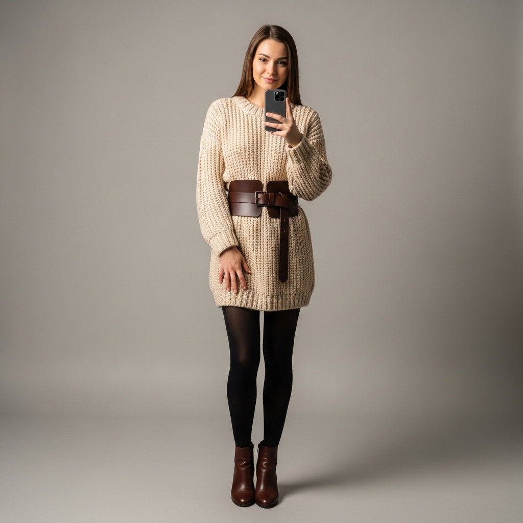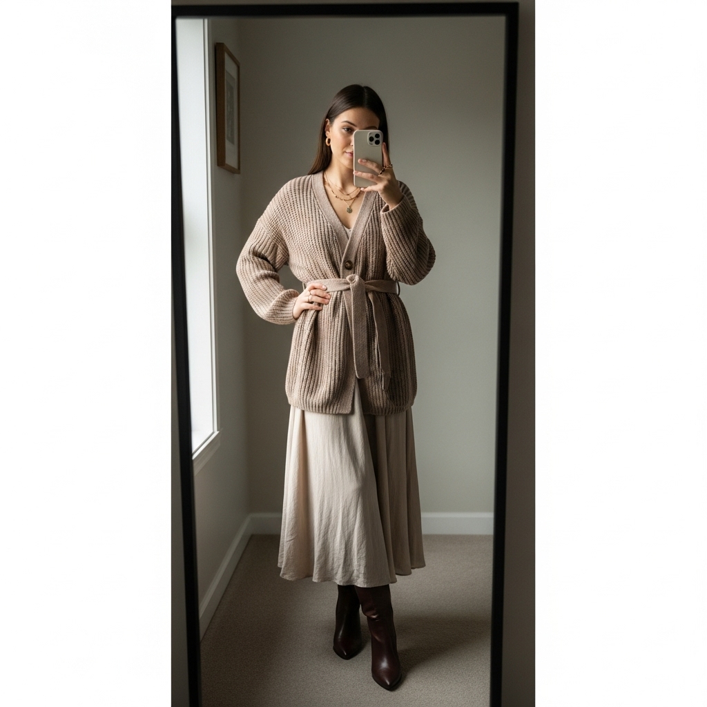 Layer a belted cardigan over a flowy midi dress for an effortless fall-ready vibe. The belt cinches the waist, creating a balanced hourglass figure while still keeping you warm. Pair with heeled boots to elongate your frame and add a touch of elegance. Choose earthy tones like olive or burnt orange to keep the seasonal feel strong. This outfit works perfectly for brunch dates or office settings.