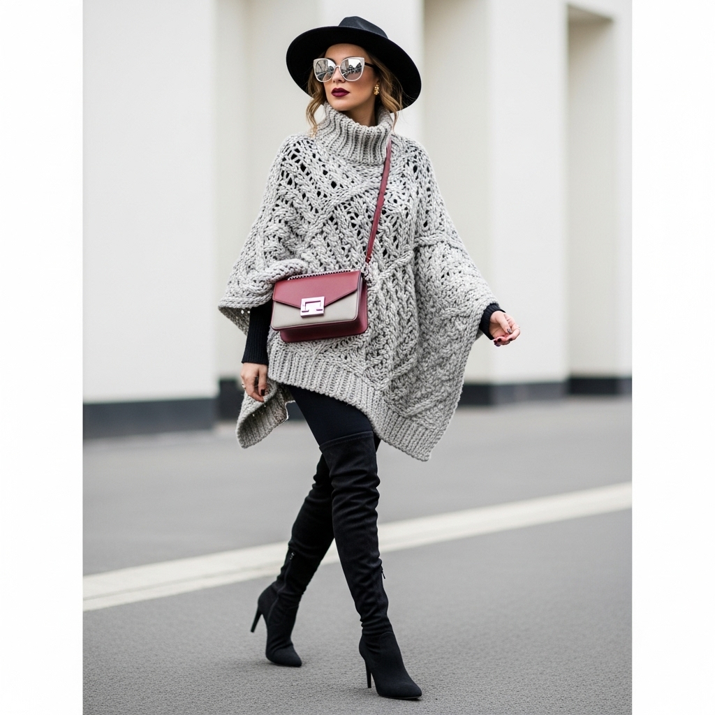 A knit poncho is a statement piece that adds instant style to your fall wardrobe. Pair it with classic black leggings for balance and tall boots to elongate the legs. Opt for neutral ponchos with fringe or patterns to keep the outfit chic. Add minimal jewelry for polish. This plus size outfit is warm, comfortable, and stylish—perfect for travel days or cozy nights out.