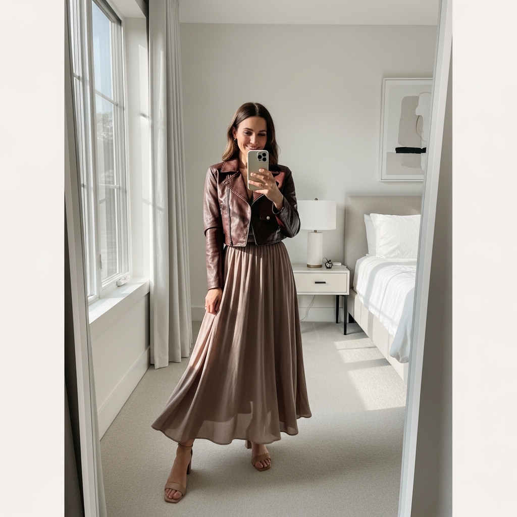 Add a touch of edge with a faux leather jacket styled over a flowy midi skirt. The contrast between edgy and feminine makes this outfit stand out. Pair it with ankle boots or block heels to complete the look. Stick with skirts in earthy hues or subtle prints for a fall vibe. This plus size outfit works great for evening plans or casual date nights.