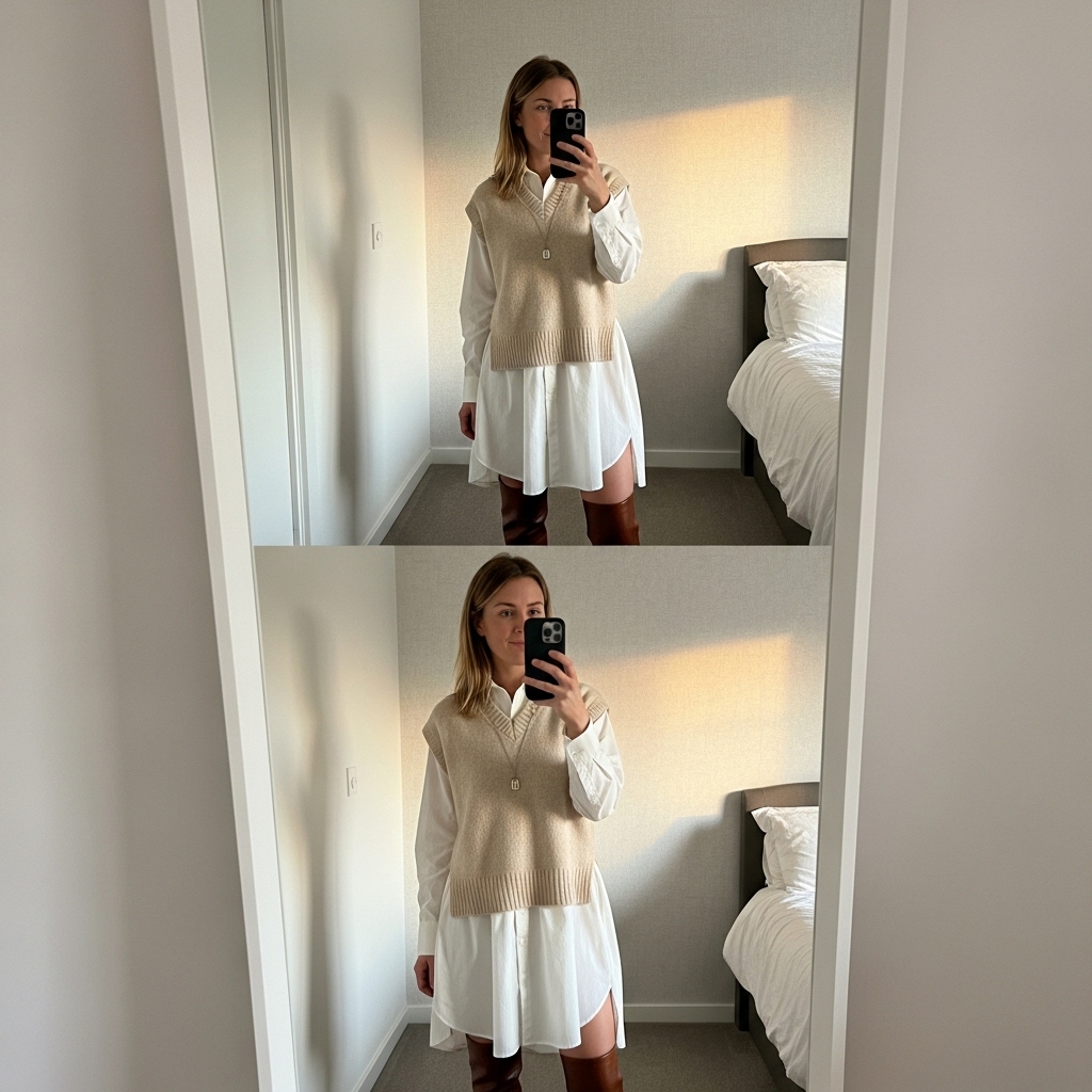 A trendy yet classic option is layering a sweater vest over a crisp shirt dress. Add knee-high boots to elevate the outfit, and layer with a trench coat for colder days. Choose neutral or plaid vests for a timeless appeal. This plus size outfit offers a preppy yet chic vibe, making it perfect for fall outings, school events, or casual workplace looks.