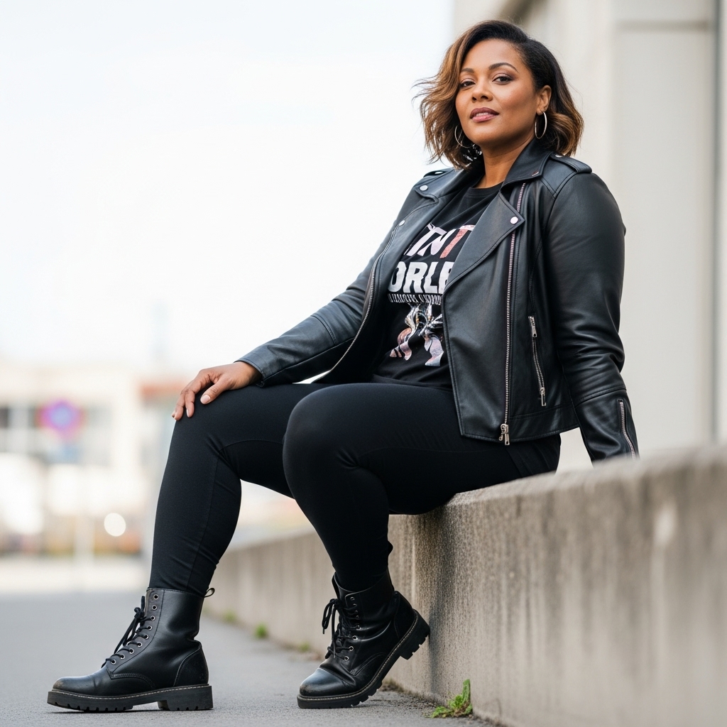 A moto jacket instantly elevates any outfit, especially when paired with sleek black leggings. Add a graphic tee underneath for a cool vibe and finish with sneakers or combat boots. Stick to neutral or dark-colored jackets for versatility. This plus size fall outfit is edgy, bold, and perfect for casual hangouts, concerts, or city nights.