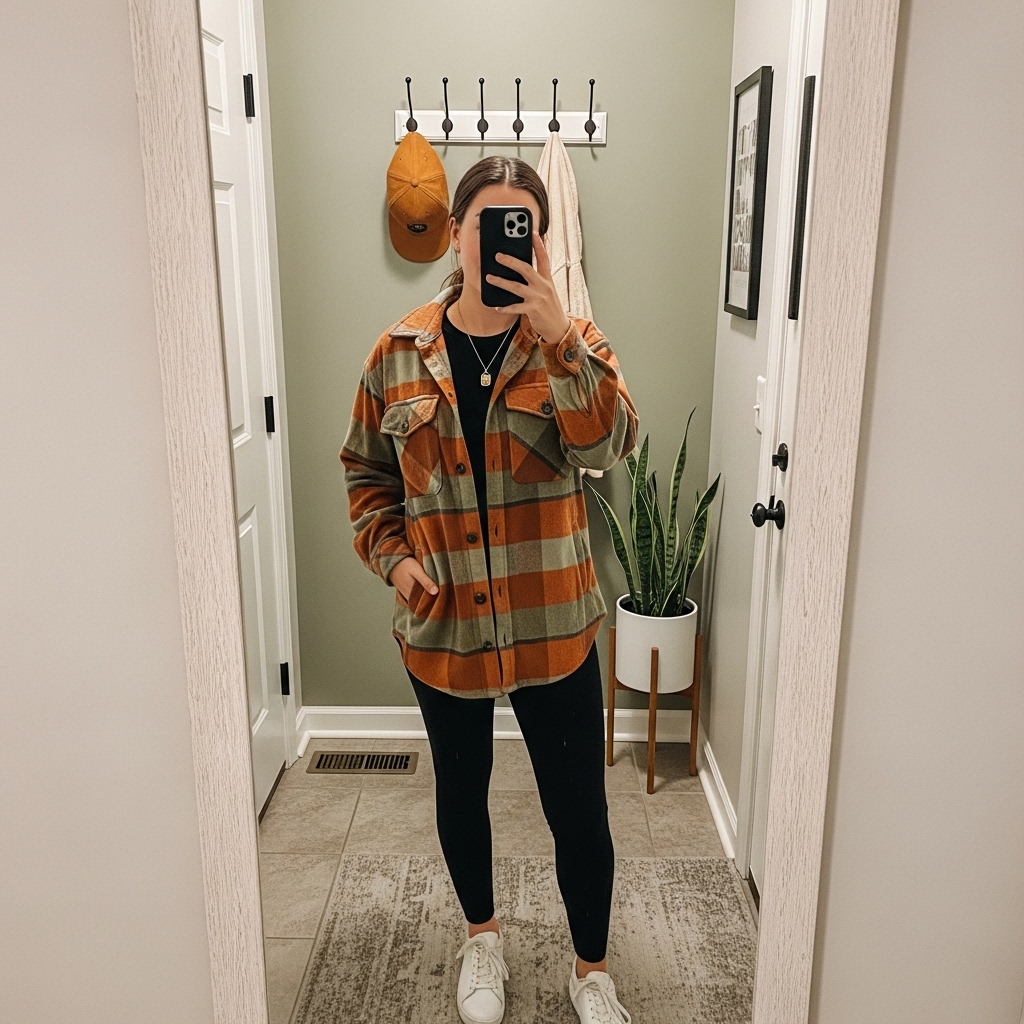 Shackets (shirt-jackets) are a fall essential, and they look amazing styled over black leggings. The structure of the shacket gives your outfit dimension while keeping it casual yet polished. Pair it with combat boots or sneakers for a laid-back, cool vibe. Opt for plaid patterns in browns, blacks, or creams to make it fall-appropriate. This plus size outfit is a go-to for cozy weekend errands or casual hangouts.
