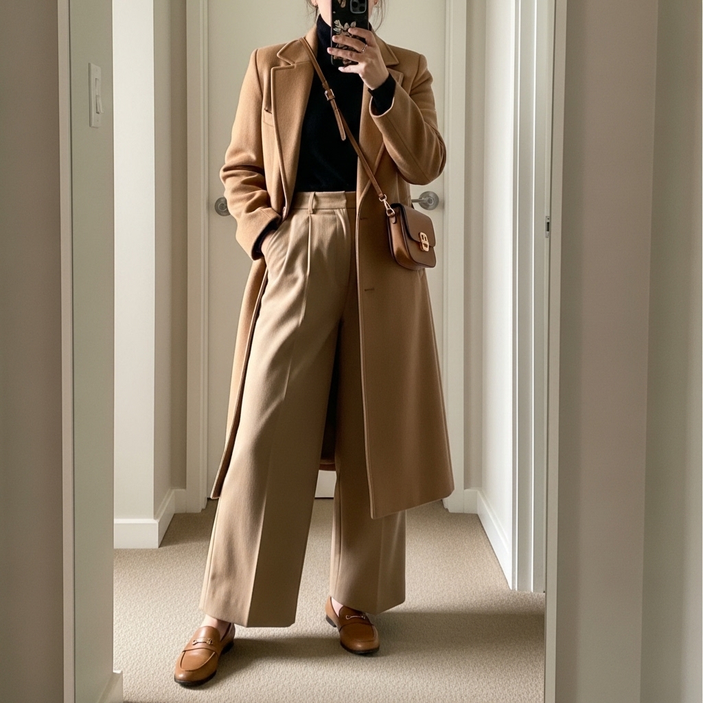 For a sophisticated plus size fall outfit, style a longline coat with wide-leg trousers. This look elongates your figure and provides a modern, classy aesthetic. Stick with neutral coats like camel, tan, or black and pair with crisp white tops underneath. Add loafers or block-heeled boots to finish it off. This outfit is perfect for work meetings, city days, or even chic dinners.
