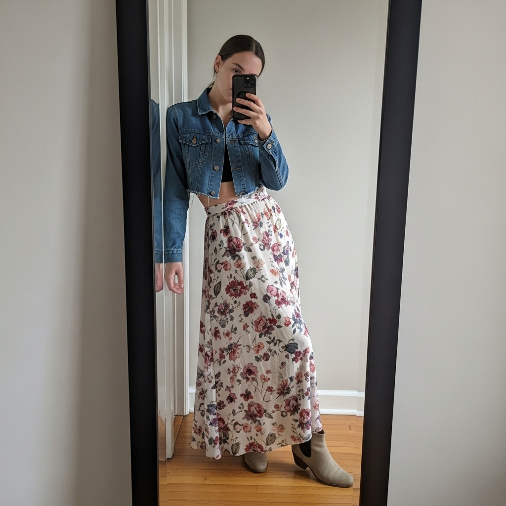 Mix casual and feminine by pairing a denim jacket with a flowy maxi skirt. This balance of textures gives a stylish contrast while being easy to wear. Add ankle boots for an autumn touch, or sneakers for a more casual vibe. Dark floral skirts or earthy solid colors pair best for fall. This plus size outfit is perfect for daytime outings, picnics, or casual gatherings.