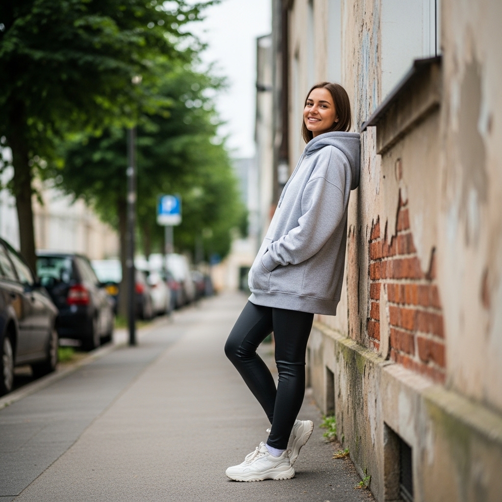 For an edgy yet comfy vibe, wear a soft oversized hoodie with sleek leather leggings. The mix of cozy and bold textures makes this a trendy fall plus size outfit. Complete the look with chunky sneakers or combat boots. Stick to darker shades like black, charcoal, or deep navy for a slimming effect. This outfit is perfect for casual city strolls, travel days, or relaxed weekends.