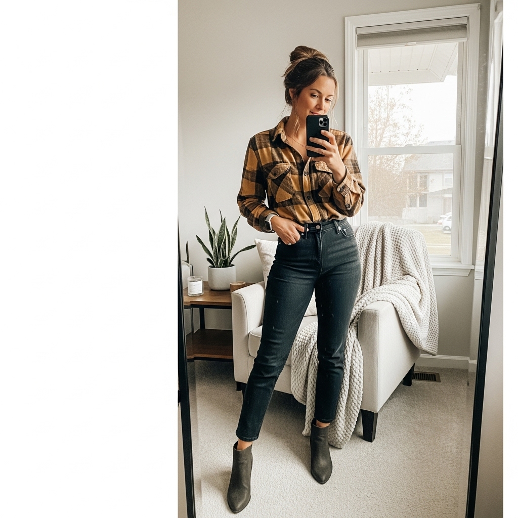 Nothing says fall like a flannel shirt. Style it with black jeans and ankle boots for a laid-back, cozy vibe. You can wear it buttoned up or open over a simple tee for layering. Plaids in warm colors like rust, mustard, and forest green enhance the autumn look. This plus size outfit is casual yet stylish, perfect for pumpkin patch trips or casual nights out.