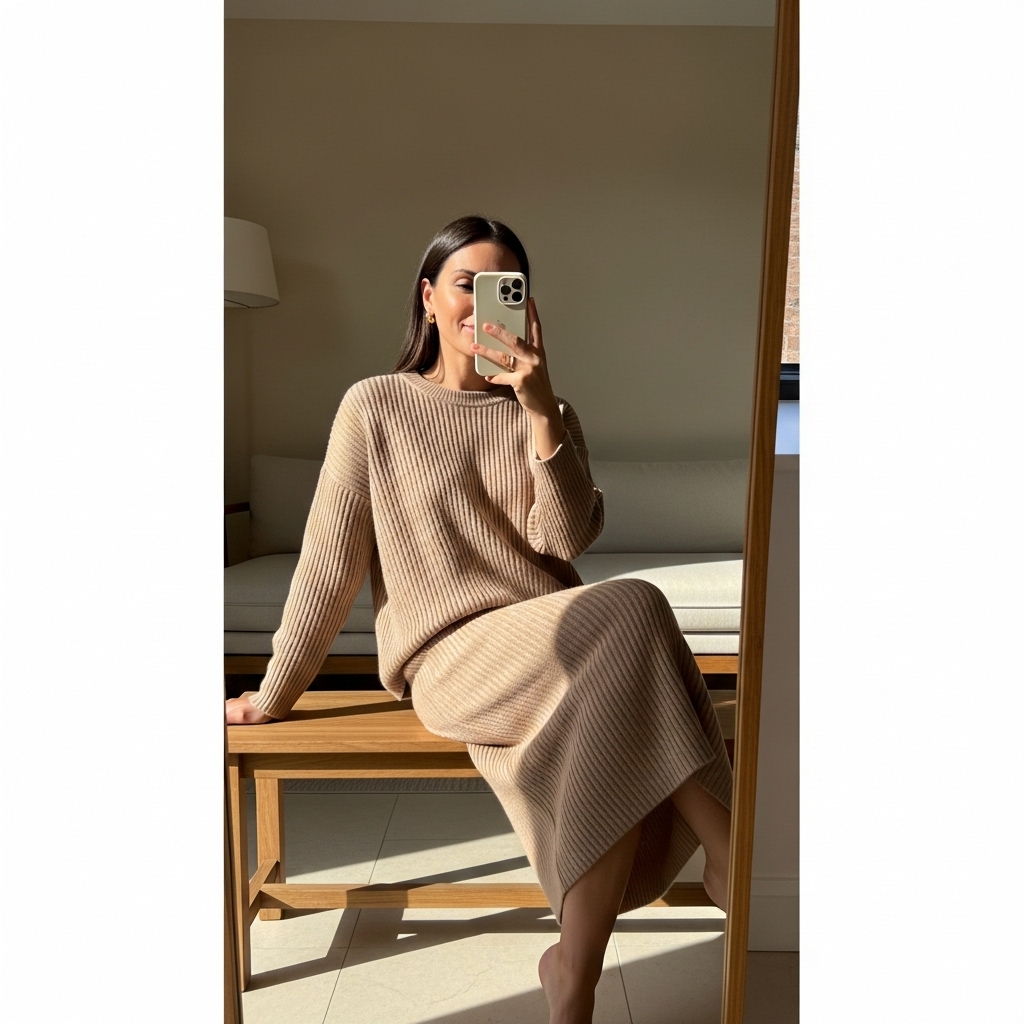 A matching knit set is cozy perfection for fall. Choose a ribbed or cable-knit skirt and matching sweater in soft beige or caramel tones. Accessorize with a beret or dainty jewelry for a touch of elegance. This monochrome outfit feels put-together yet effortlessly relaxed.